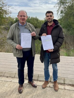 El 𝗽𝗼𝗿𝘁𝗮𝘃𝗼𝘇 𝗱𝗲𝗹 𝗚𝗿𝘂𝗽𝗼 𝗣𝗼𝗽𝘂𝗹𝗮𝗿, 𝗝𝗮𝘃𝗶𝗲𝗿 𝗦𝗮́𝗻𝗰𝗵𝗲𝘇 𝗥𝗼𝘀𝗲𝗹𝗹𝗼́, acompañado por el concejal 𝗕𝗲𝗻𝗷𝗮𝗺𝗶́𝗻 𝗖𝗮𝗹𝗲𝗿𝗼, han comparecido en el solar donde debería haberse iniciado ya la construcción de la nueva instalación deportiva, y que hoy, más de dos años después, sigue siendo un terreno vacío.